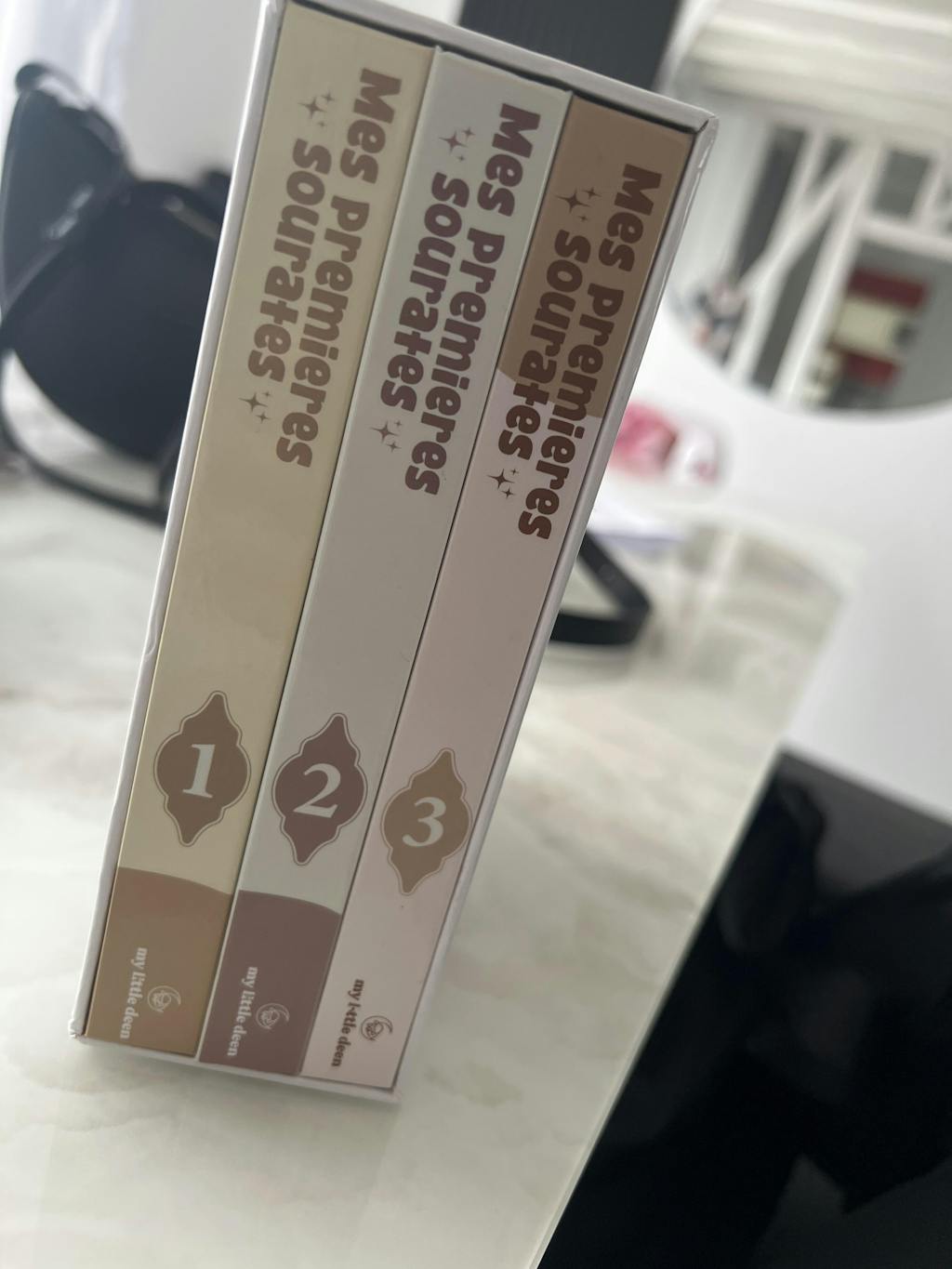 J'ai acheté ce coffret pour ma fille de 3 ans qui a beaucoup aimé et s’est tout de suite mise à répéter les récitations. La présentation est de qualité. J’espère que vous en ferez d’autres inchaAllah. Qu’Allah vous récompense pour nous aider à enseigner le Coran à nos petits ❤️ barakAllah w fikoum